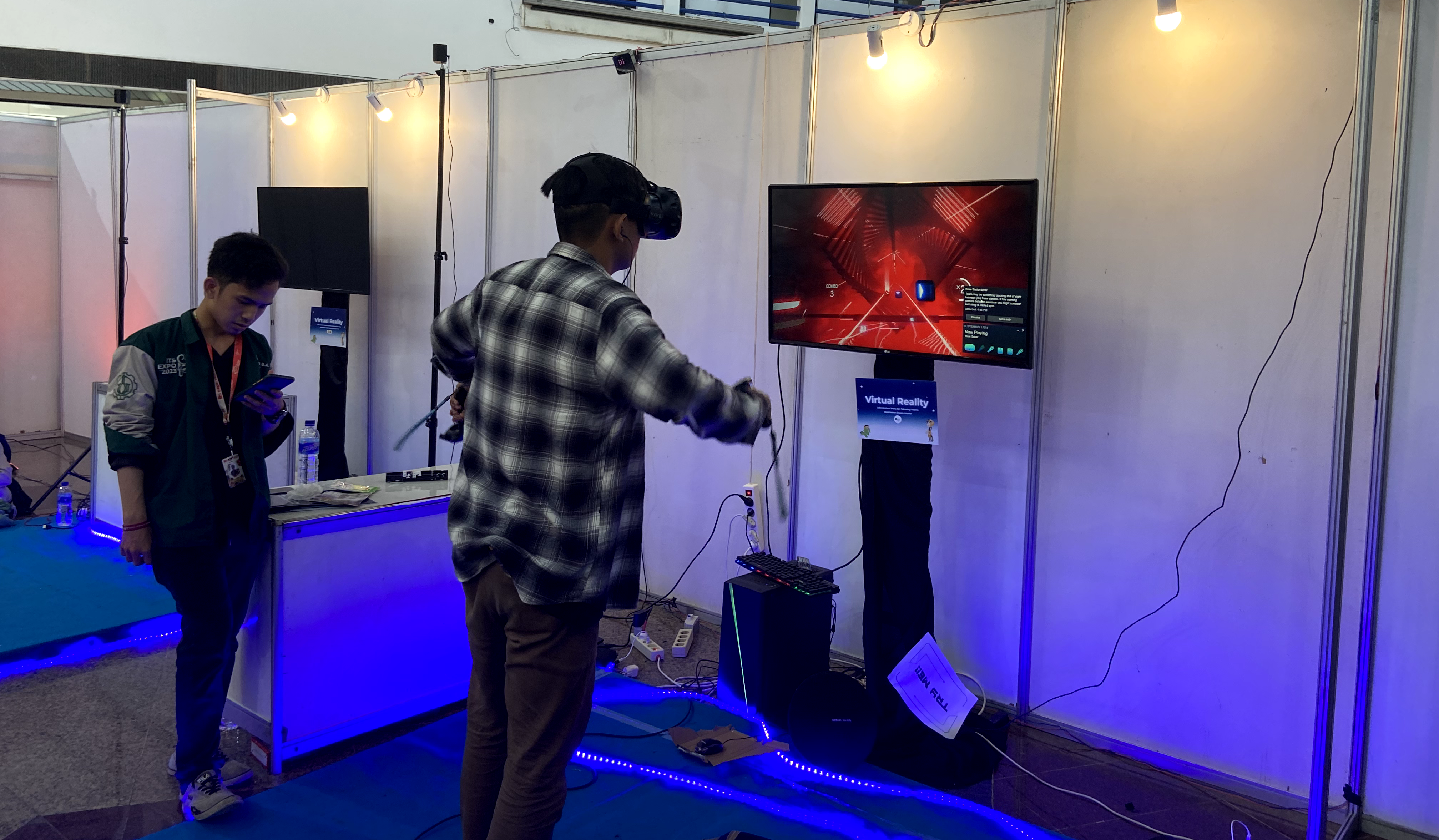 Salah satu pengunjung Exhibition ITS Expo yang bermain virtual reality (VR) di area wahana teknologi