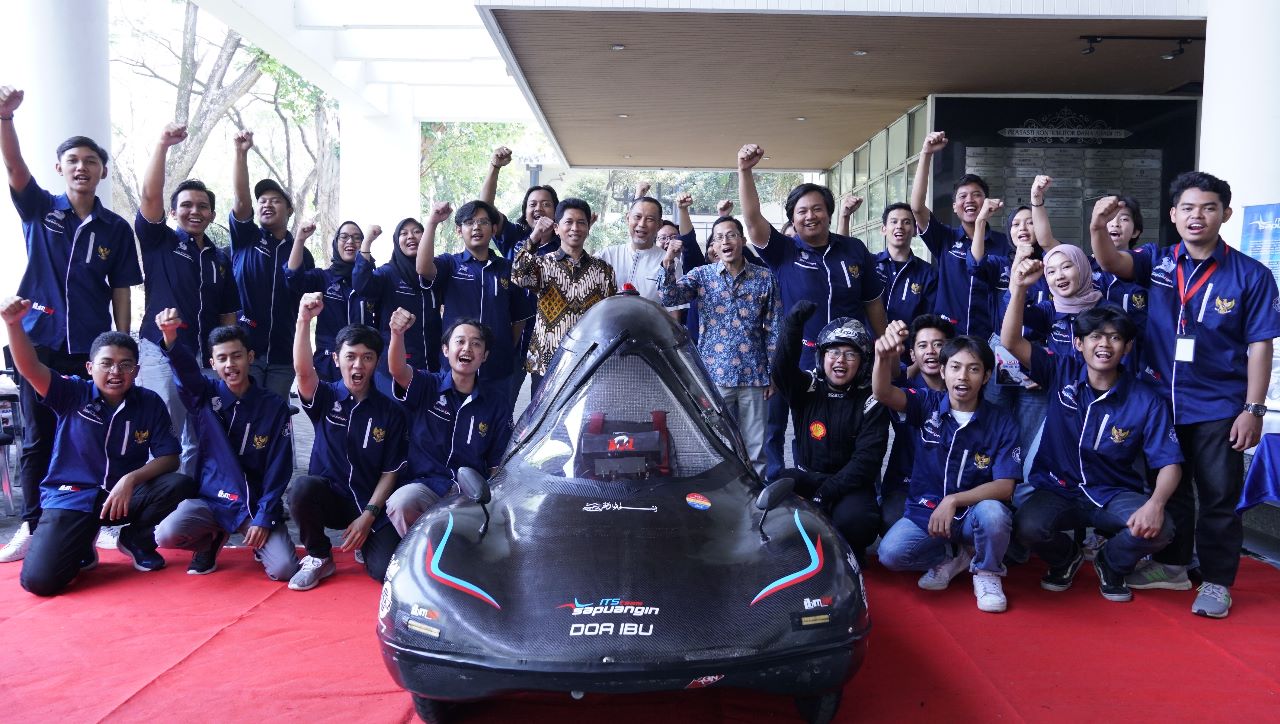 Wakil Rektor IV ITS Bambang Pramujati ST MScEng PhD, Dosen Pembimbing Sapuangin Dr Ir Witantyo MEngSc, beserta Tim Sapuangin ITS saat launching mobil Sapuangin XI Evo 3