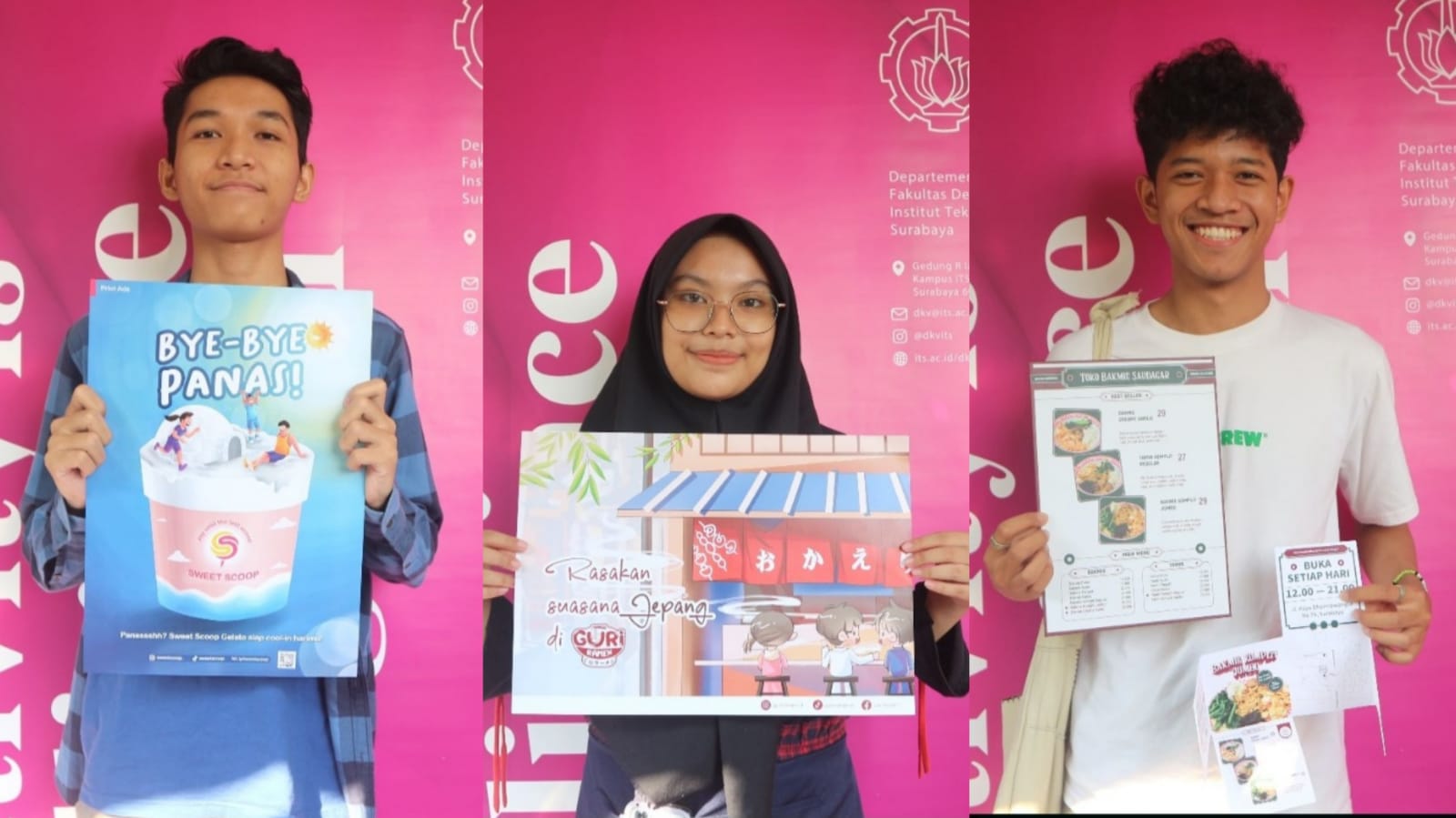 (dari kiri) Didan Aulia Ikhsan Ulil Albab, Qonita Qurrotu Aini, dan Raihan Jafni, para mahasiswa DKV ITS memamerkan poster promosi UMKM mereka
