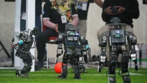 Robot Tim Ichiro saat hendak mencetak gol ke kandang lawan pada kategori Kontes Robot Sepak Bola Indonesia-Humanoid di ajang Kontes Robot Indonesia (KRI) 2023