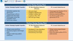 Penjelasan peran dan manfaat yang diberikan dari pihak ITS dan PT Biro Klasifikasi Indonesia, serta PT Aerotek Global Inovasi sebagai mitra untuk inovasi yang dikembangkan