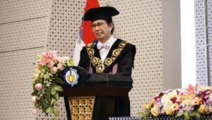 Rektor ITS Prof Dr Ir Mochamad Ashari MEng saat menyampaikan sambutannya dalam acara Pengukuhan Profesor ITS di Gedung Pusat Riset ITS