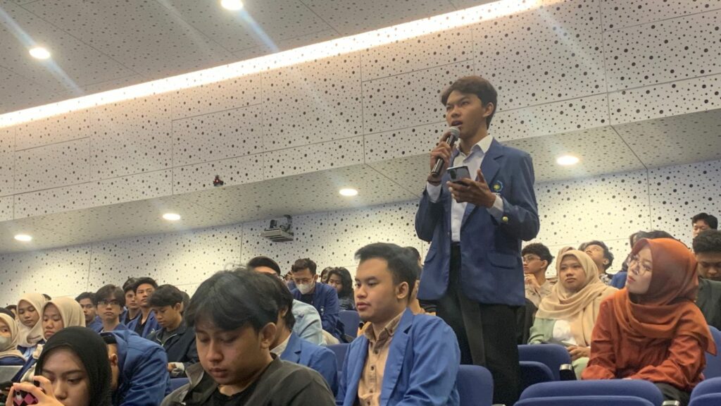 Mahasiswa ITS melemparkan pertanyaan kepada Afif Kurniawan SPsi MPsi Psikolog mengenai pentingnya manajemen stres dalam membangun sebuah bisnis