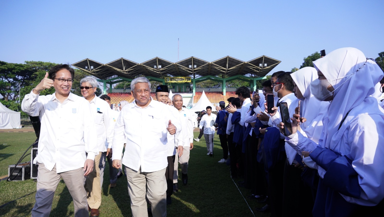Rektor dan jajaran pimpinan ITS menyapa para mahasiswa baru ITS 2023 yang bersiap mengikuti acara pengukuhan di Stadion ITS