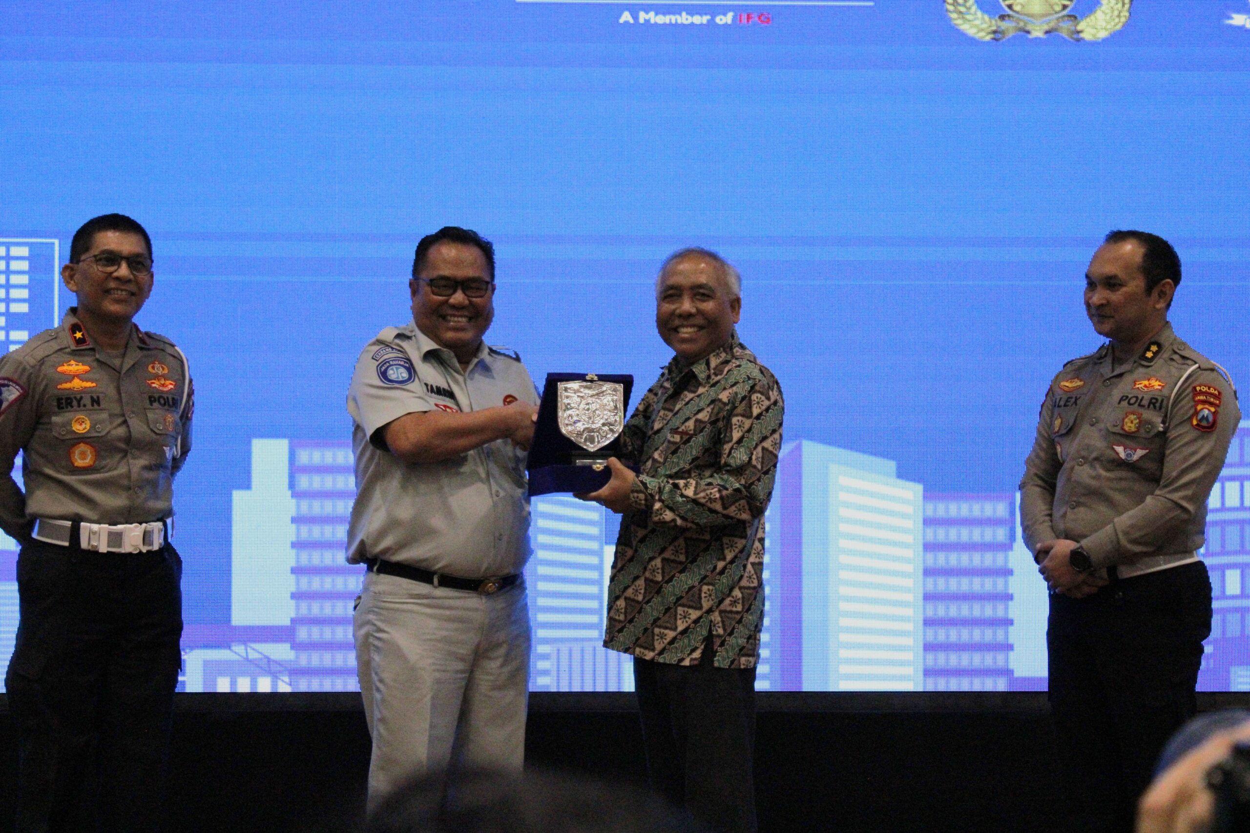 Penyerahan plakat dari Kepala PT Jasa Raharja Cabang Utama Jawa Timur, Tamrin Silalahi (dua dari kiri) kepada Wakil Rektor I ITS, Prof Dr Ir Adi Soeprijanto MT (tengah berbaju batik)