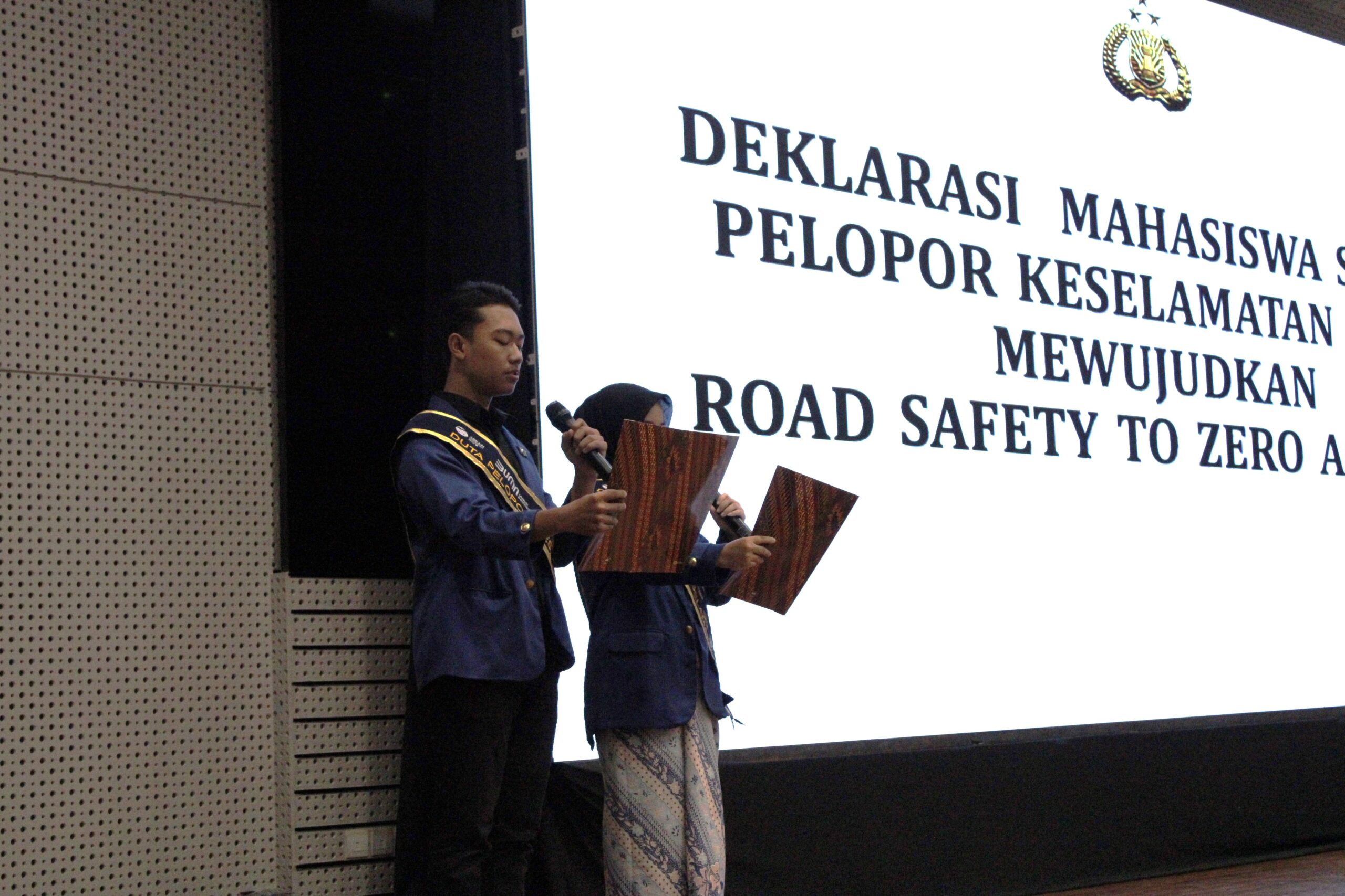 Perwakilan mahasiswa ITS sebagai Duta Pelopor Keselamatan Berlalu Lintas saat melakukan deklarasi untuk mewujudkan road safety to zero accident
