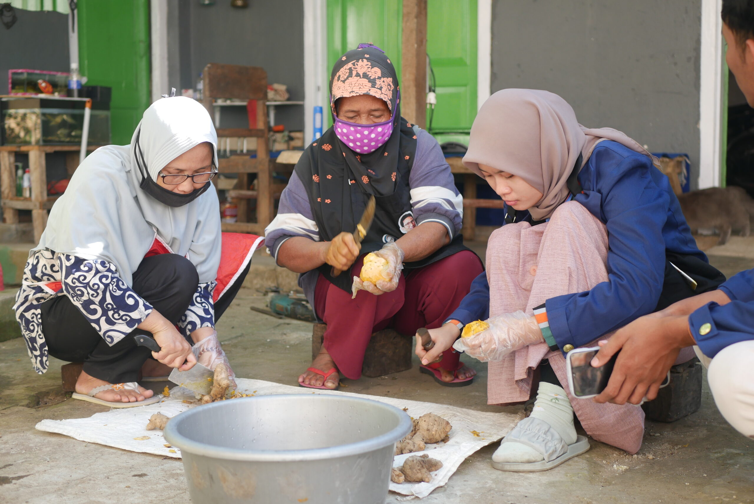 Salah satu anggota tim KKN-PM Wengker ITS membantu pelaku UMKM Desa Paringan