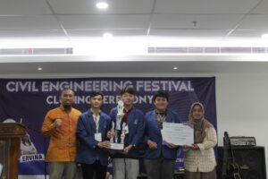 Tim The Civil Conqueror ITS yang berjas almamater (dari kiri) Nathaniel Nico Prawira, Adi Drajad Budiman, dan Royce Giovano Sutikno usai menerima penghargaan lomba