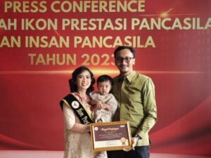 Latifah Nurahmi ST MSc PhD (kiri) bersama keluarga pada acara Penganugerahan Ikon Prestasi dan Insan Pancasila 2023 di Gedung Merdeka, Bandung