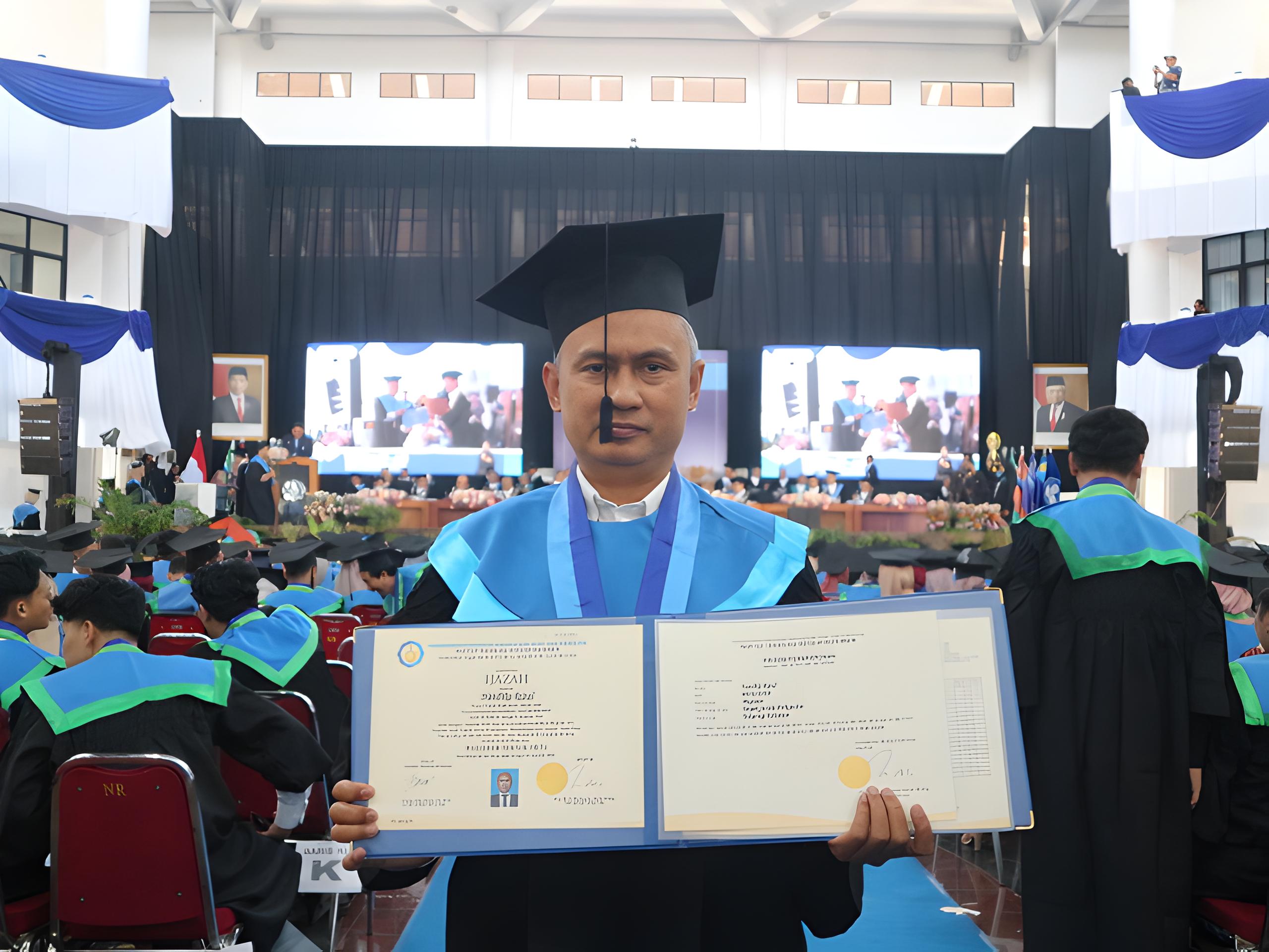 Wisudawan lulusan Siskal ITS, Nandiko Rizal, setelah menerima ijazah gelar magisternya pada Wisuda ITS ke-128