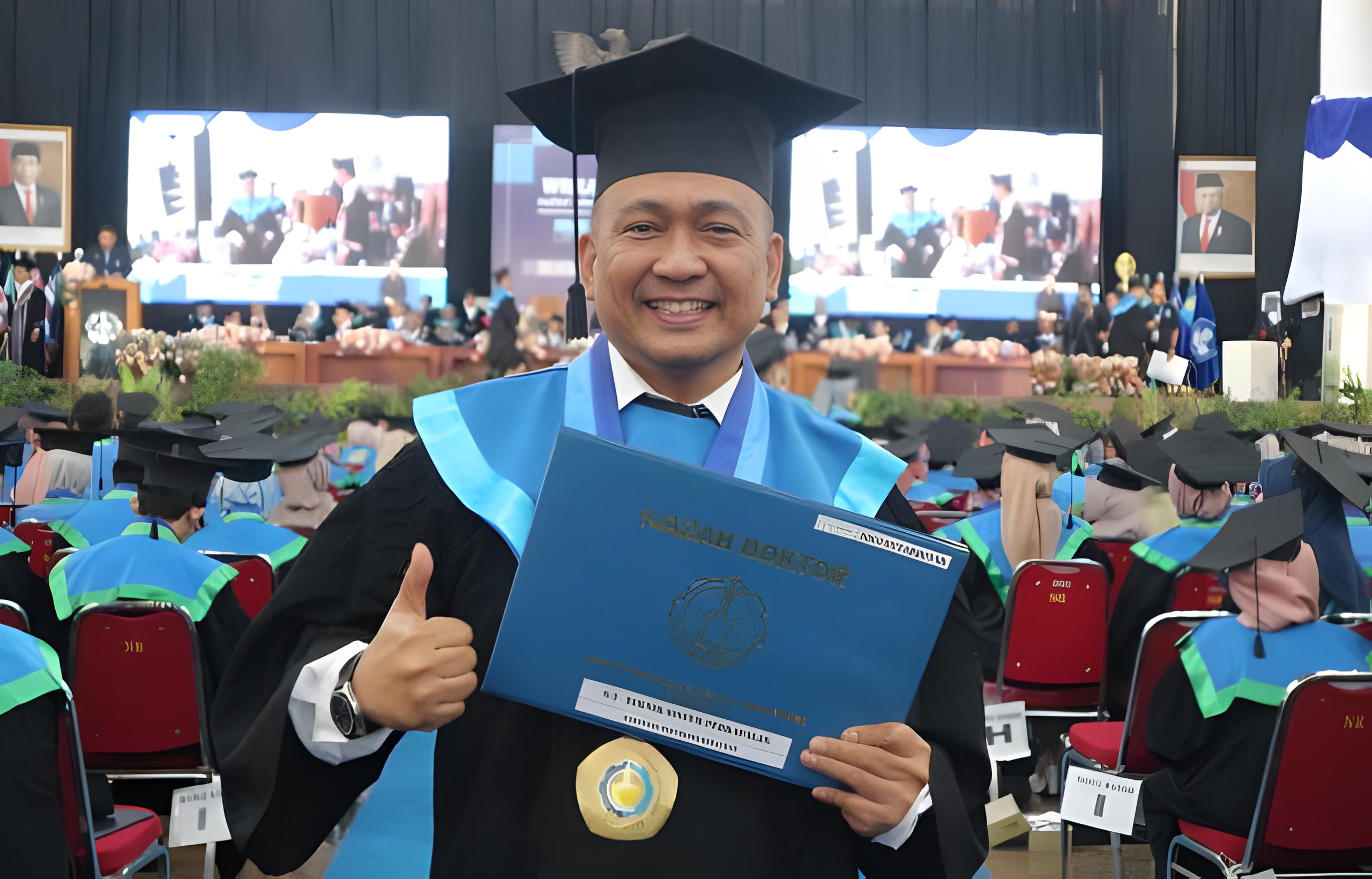 Senyum semringah Riko Butarbutar pasca menyandang gelar doktoral pada Wisuda ITS ke-128