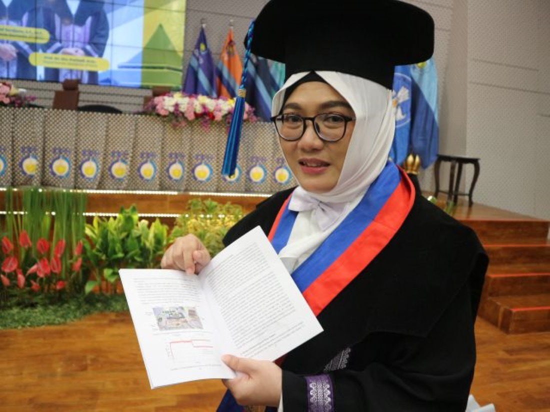 Guru besar ke-164 ITS Prof Dr Katherin Indriawati ST MT menunjukkan ilustrasi alat pengujian dalam penelitiannya
