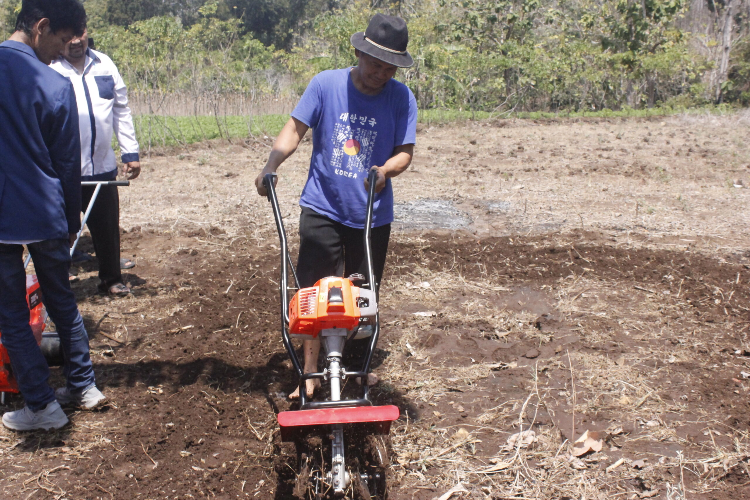 Salah satu petani dari Poktan LMPSDH Wonodadi saat mencoba mesin penggembur tanah