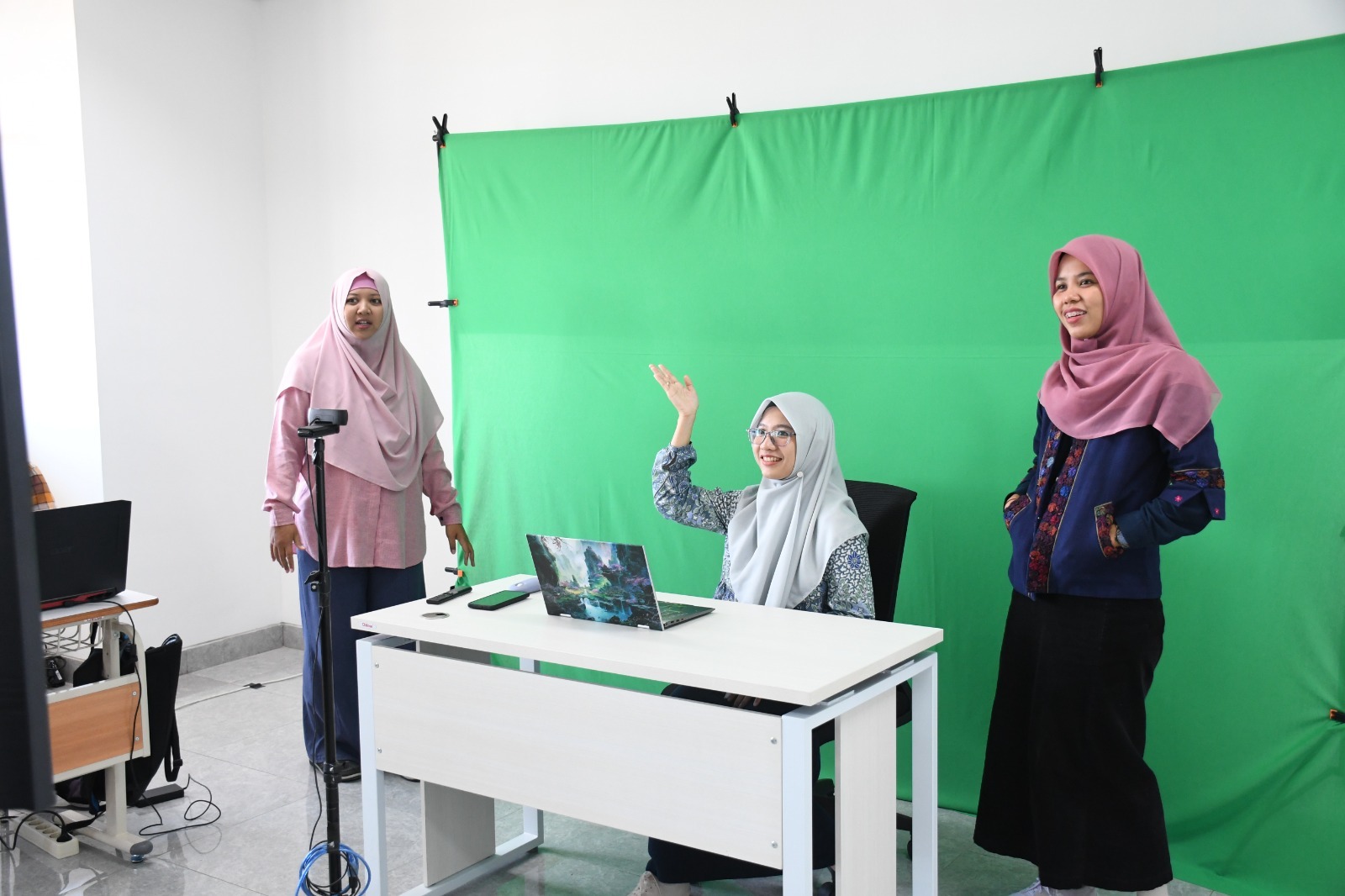 (dari kiri) Henning Titi Ciptaningtyas SKom MKom, Nefy Puteri Novani MT, dan Rizka Hadelina MT ketika berada di balik layar untuk membuat video imersif untuk meningkatkan minat mahasiswa ketika pembelajaran daring