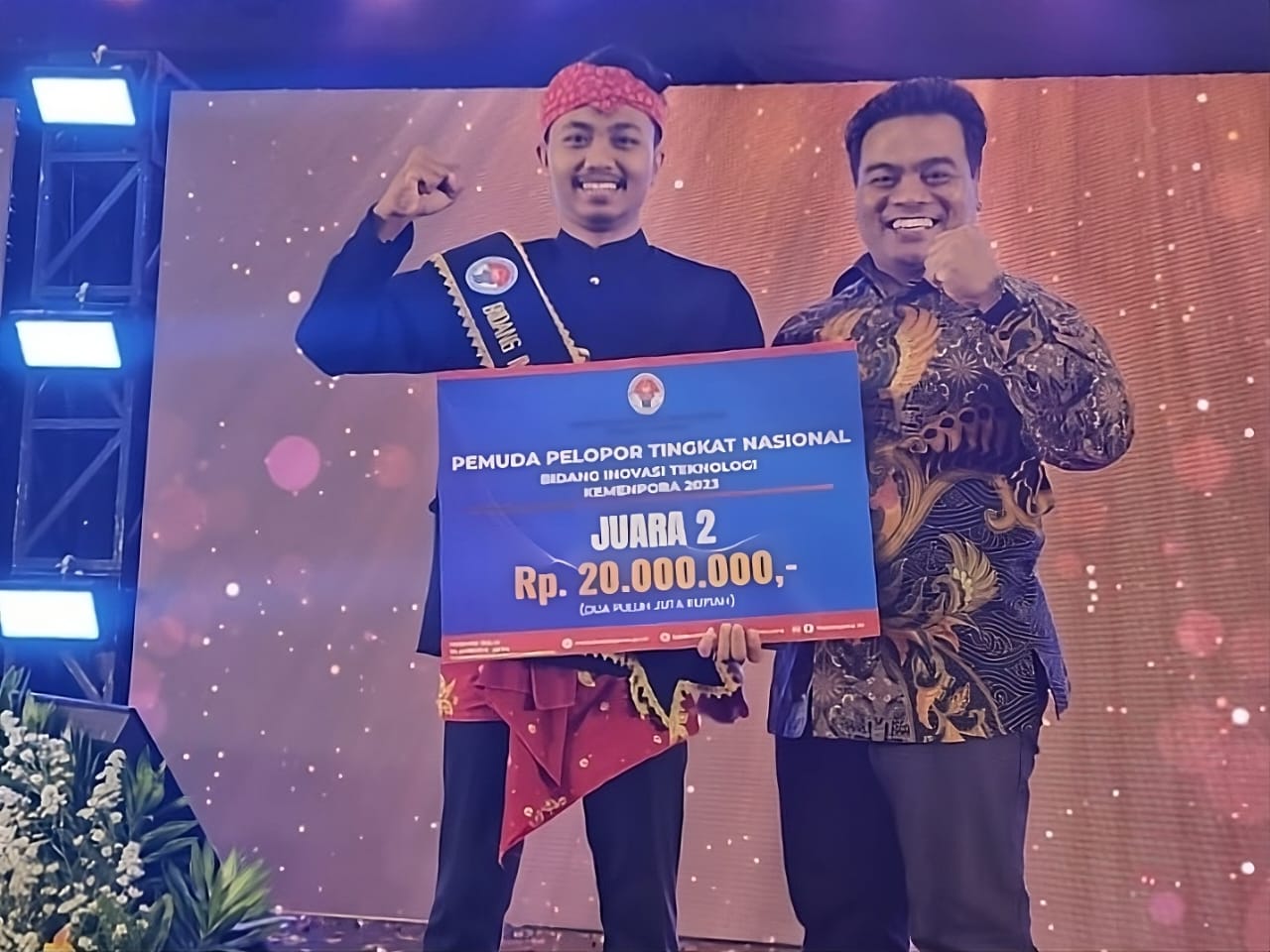 Ramadhita Putra Purnomo (kiri), mahasiswa ITS peraih Juara 2 Pemuda Pelopor Nasional 2023 bersama Kepala Bidang Pemuda dan Olahraga Disporabudpar Nganjuk