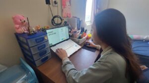 Mahasiswi Departemen Sistem Informasi ITS sedang mencoba demo aplikasi WarungKu