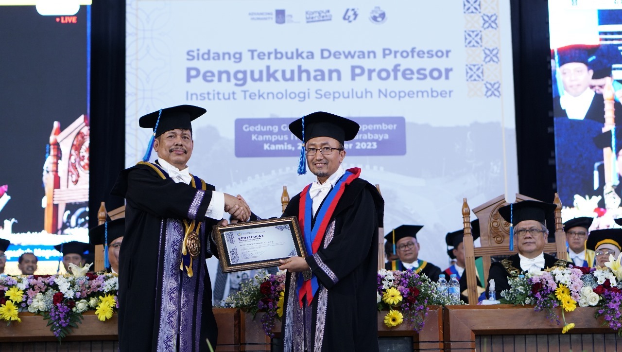 Prof Agung Purniawan ST MEng (kanan) ketika menerima sertifikat pengukuhan menjadi Guru Besar ke-184 ITS oleh Ketua Dewan Profesor ITS Prof Dr Imam Robandi MT