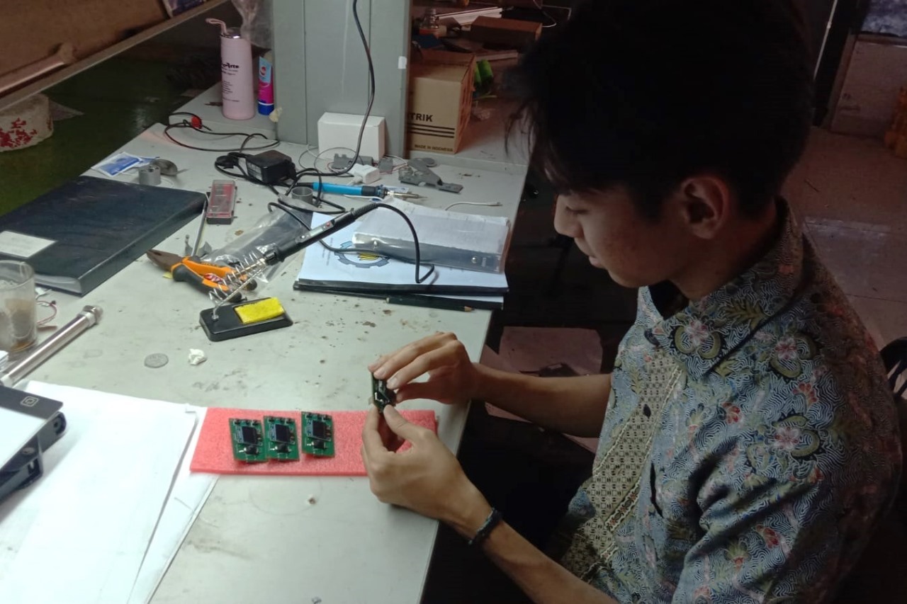 Revelyno Rellert Towidjojo, salah satu anggota Tim Hemoglobest ITS, saat merangkai kompartemen Hemoglobest, alat detektor hemoglobin rancangan timnya