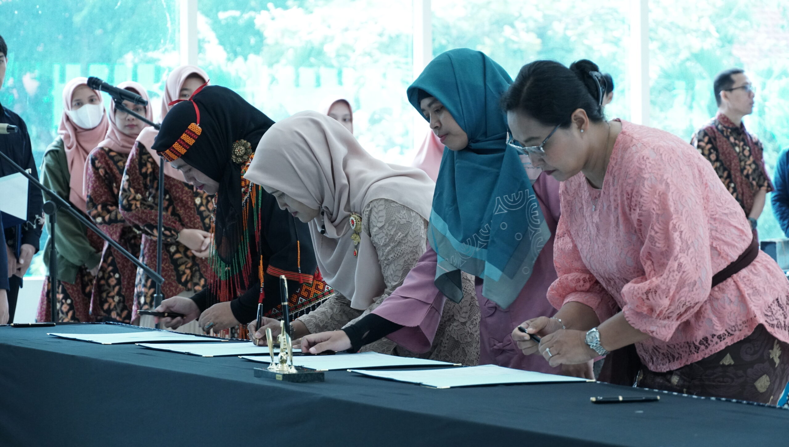 Penandatanganan naskah berita acara sumpah jabatan oleh pejabat baru, (dari kiri) Anies Rosdyana SStat, Eva Sundari ST, Descia Astrinia Raisyah SPd, Artin Finalita ST MMT