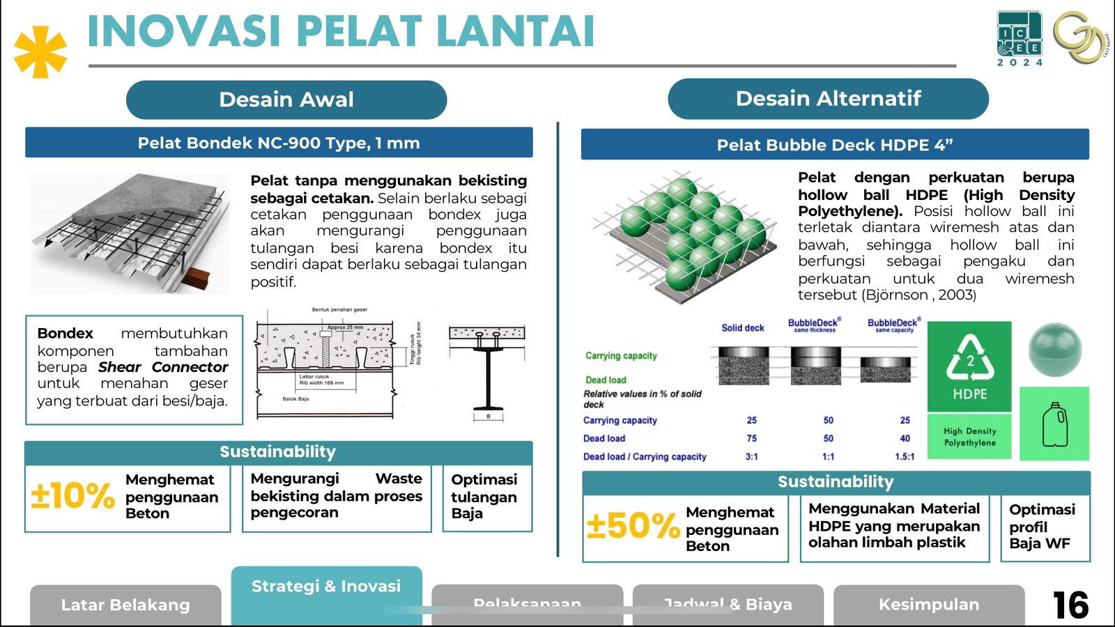 Inovasi tim Gold Digger Last Dance terkait kelebihan pelat lantai bubble deck yang digunakan, dibandingkan dengan pelat lantai bondek