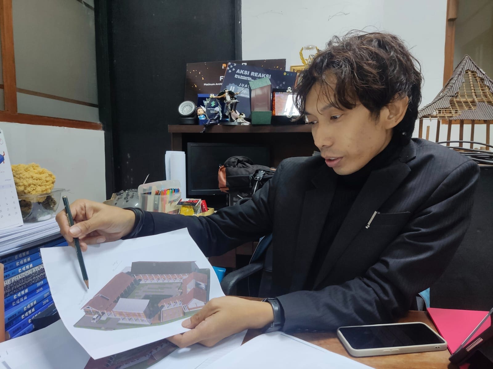 DrEng Didit Novianto ST MEng ketika menjelaskan salah satu hasil rancangannya yang mengaplikasikan arsitektur berkelanjutan pada bangunan Sekolah Dasar