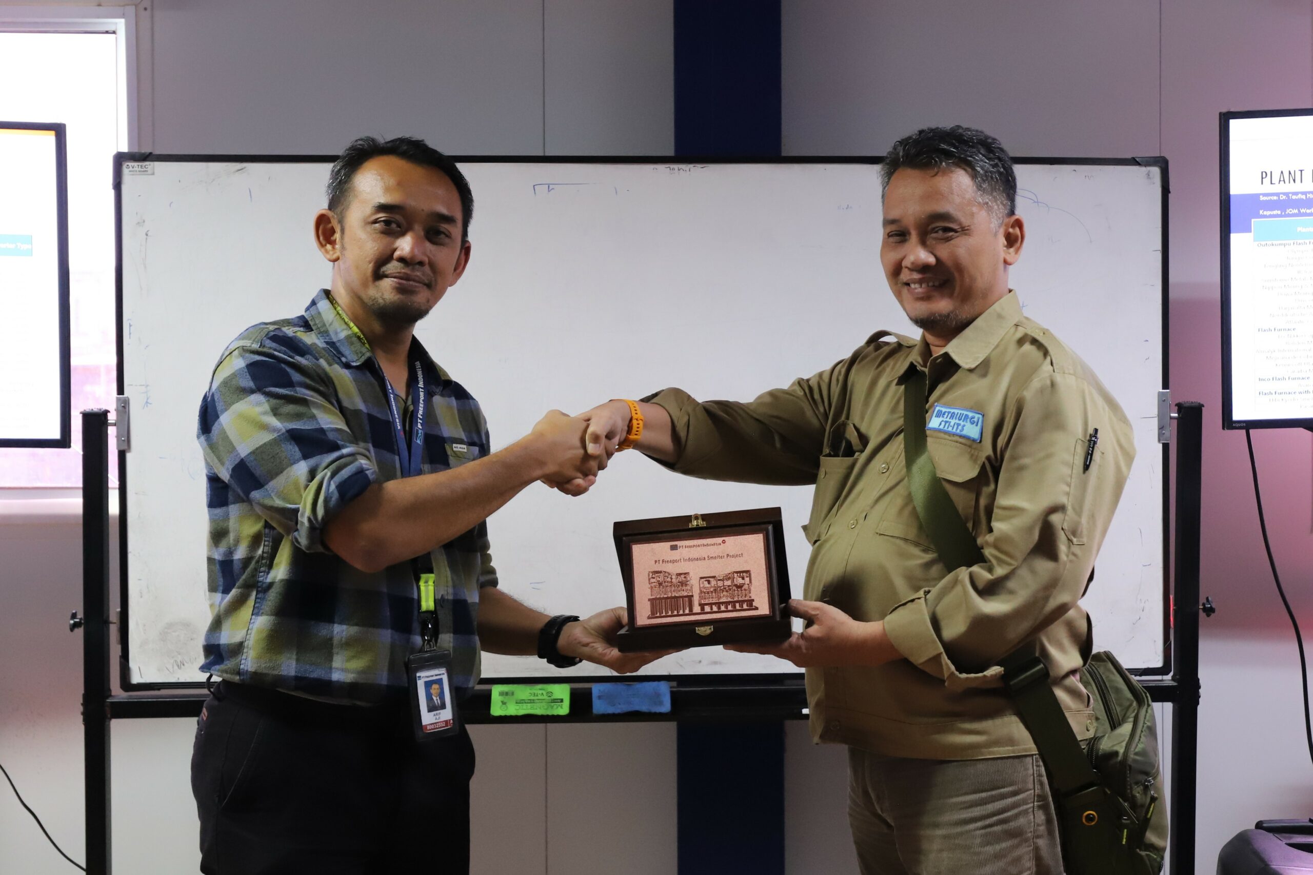Pemberian cendera mata oleh PT Freeport Indonesia, Arif Tirto Aji (kiri) kepada Departemen Teknik Material dan Metalurgi ITS