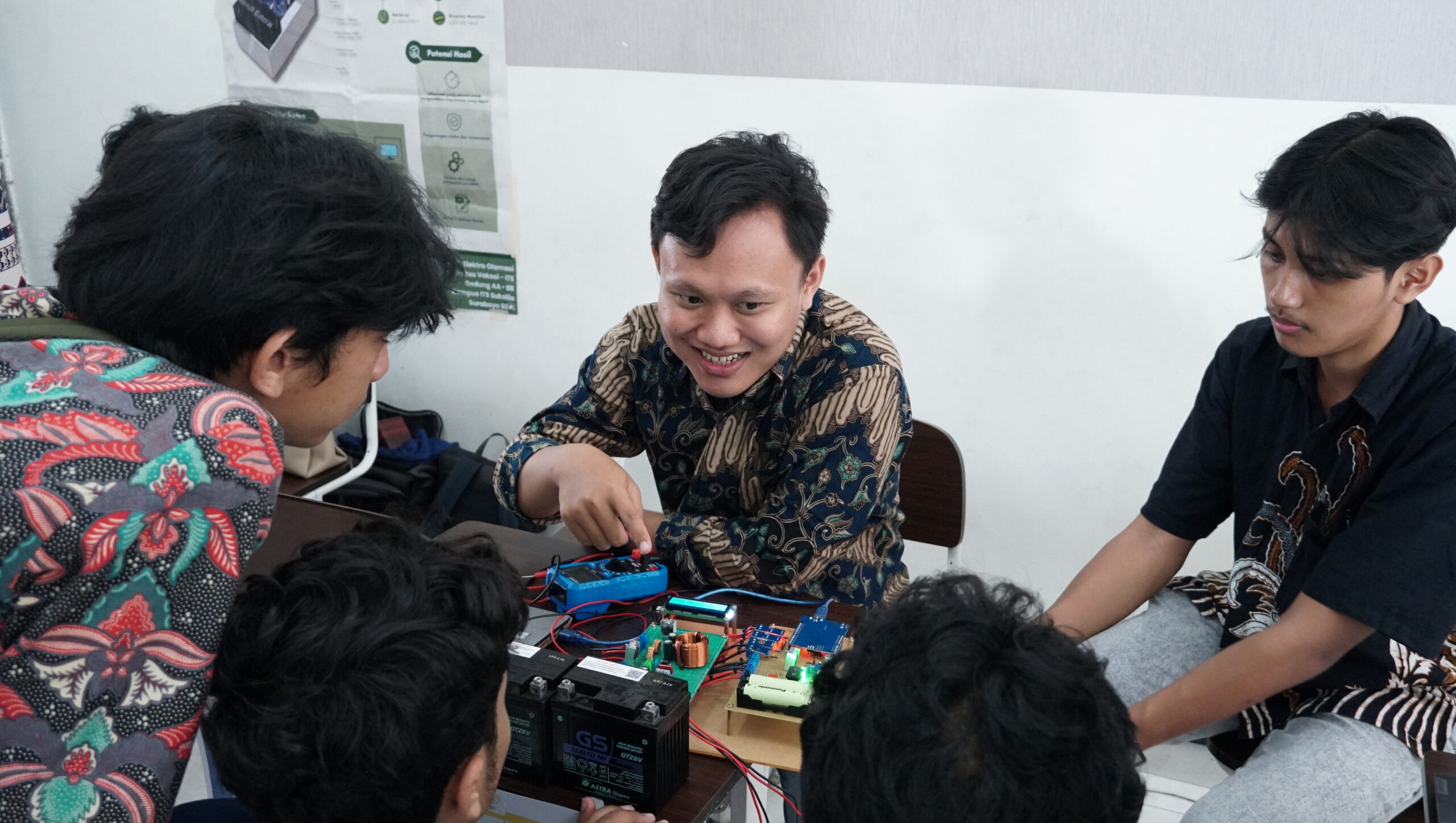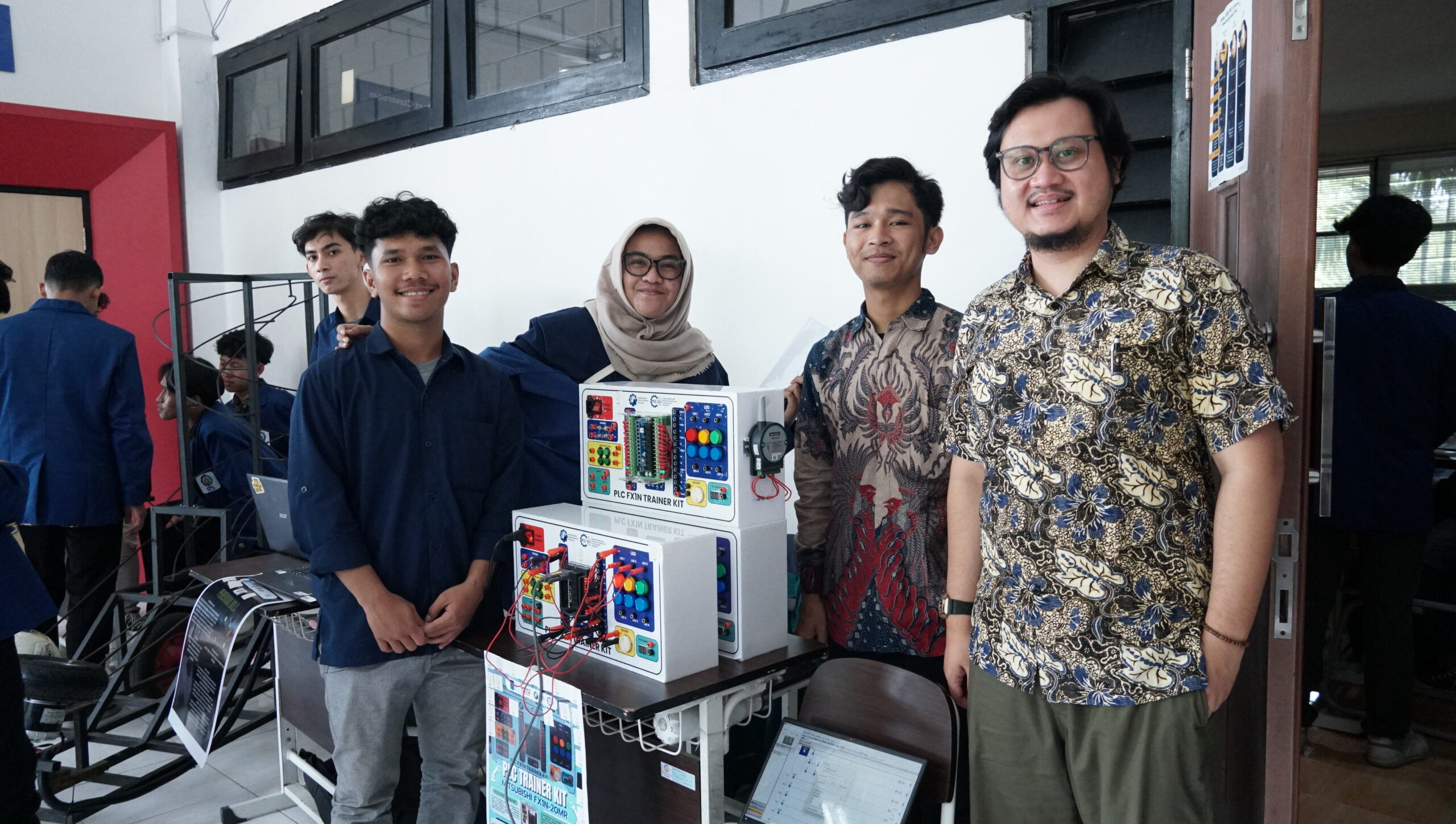 Dosen Departemen Teknik Elektro Otomasi ITS, Lutfir Rahman Aliffianto ST MT (paling kanan) bersama salah satu karya mahasiswa yang dipamerkan pada Final Project Exhibition and Competition (FIPEC) 2024