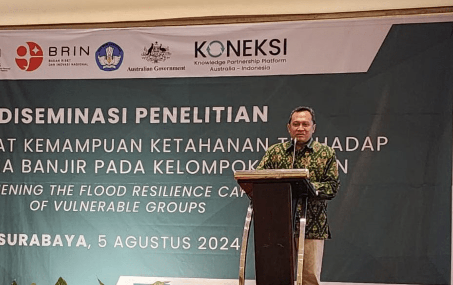Wakil Rektor ITS Bidang Riset, Inovasi, Kerja Sama, dan Kealumnian Agus Muhamad Hatta ST MSi PhD saat membuka diseminasi penelitian Memperkuat Kemampuan Ketahanan terhadap Bencana Banjir pada Kelompok Rentan, Senin (5/8)