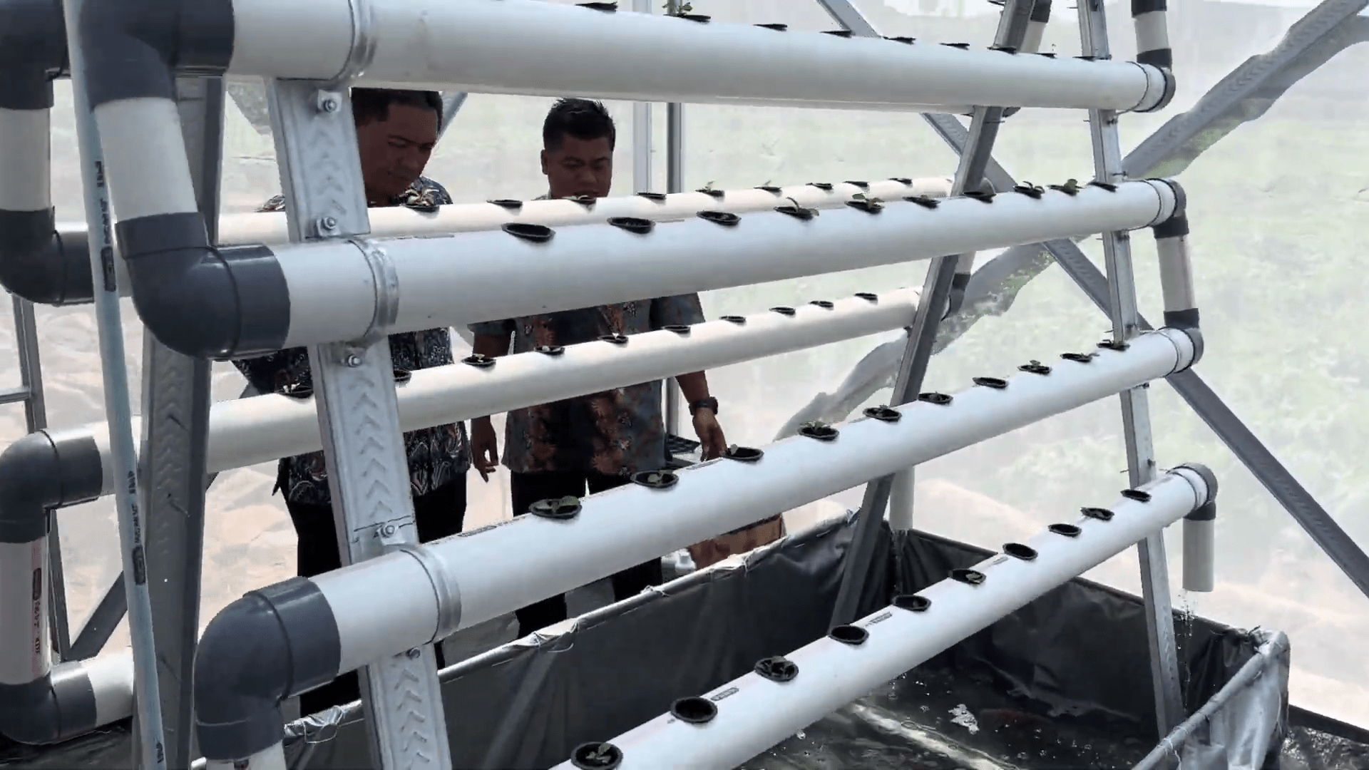 Lebih lanjut, lelaki asal Gresik tersebut menyampaikan bahwa di bawah media tanam juga terdapat kolam ikan. Tidak hanya untuk budidaya ikan, kolam tersebut juga berfungsi untuk memenuhi kebutuhan air dari tanaman yang berada di atasnya. “Air dari kolam ikan nantinya dipompa ke bagian tertinggi media tanam, lalu mengalir melewati tanaman hingga kembali lagi ke kolam,” paparnya.