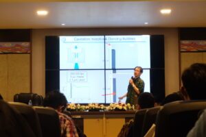 Guru besar Kobe University Prof Akira Sou selaku keynote speaker menerangkan konsep kavitasi pada kuliah tamu di Aula BG Munaf Fakultas Teknik Kelautan (FTK) ITS