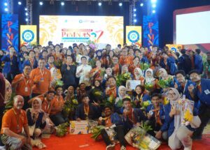 Rektor ITS Bambang Pramujati ST MSc Eng PhD (tengah baju putih) bersama kontingen Pimnas 37 ITS pada malam puncak penutupan Pimnas ke-37