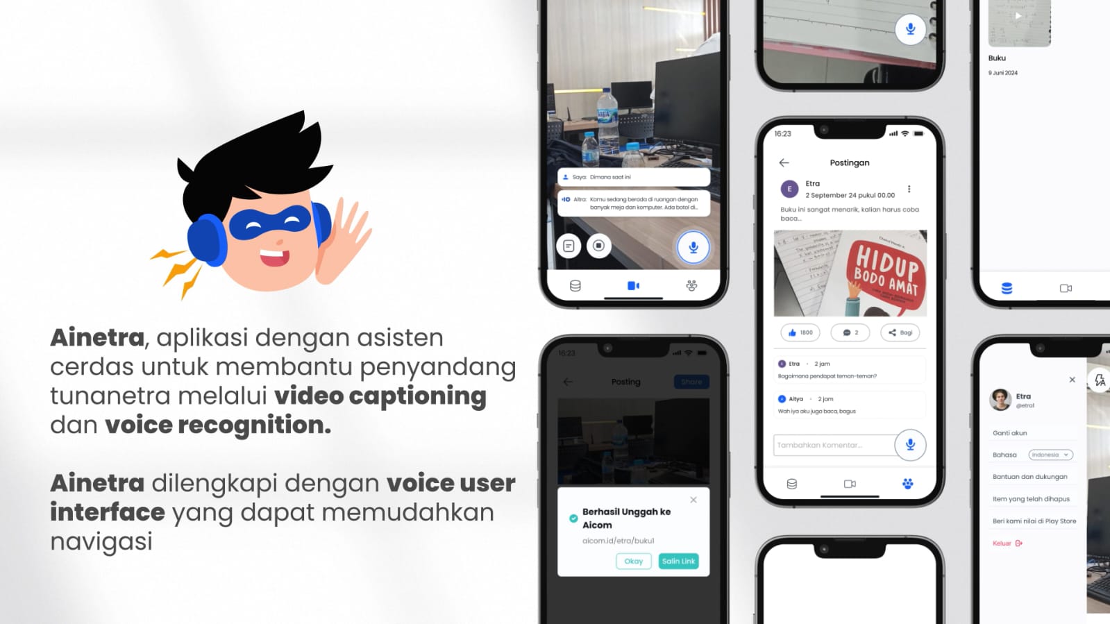 Kampus ITS, ITS News — Mempermudah aksesibilitas penyandang tunanetra dan gangguan penglihatan, tim mahasiswa Institut Teknologi Sepuluh Nopember (ITS) menginovasikan sebuah aplikasi dengan desain pengalaman pengguna (UX Design) yang ramah. Aplikasi bernama Ainetra ini hadir dengan dilengkapi asisten cerdas berbasis Voice User Interface (VUI) dan Realtime Video to Voice Recognition untuk mendampingi keseharian penggunanya.