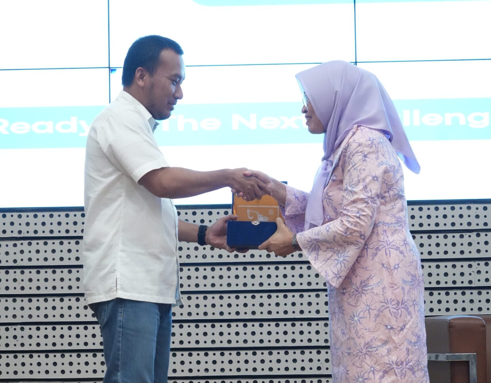 Pemberian plakat kepada Muhammad Gunawan Setiadi (kiri) selaku perwakilan PT PAMA oleh Wakil Rektor I Bidang Akademik dan Kemahasiswaan ITS Prof Nurul Widiastuti SSi MSi PhD