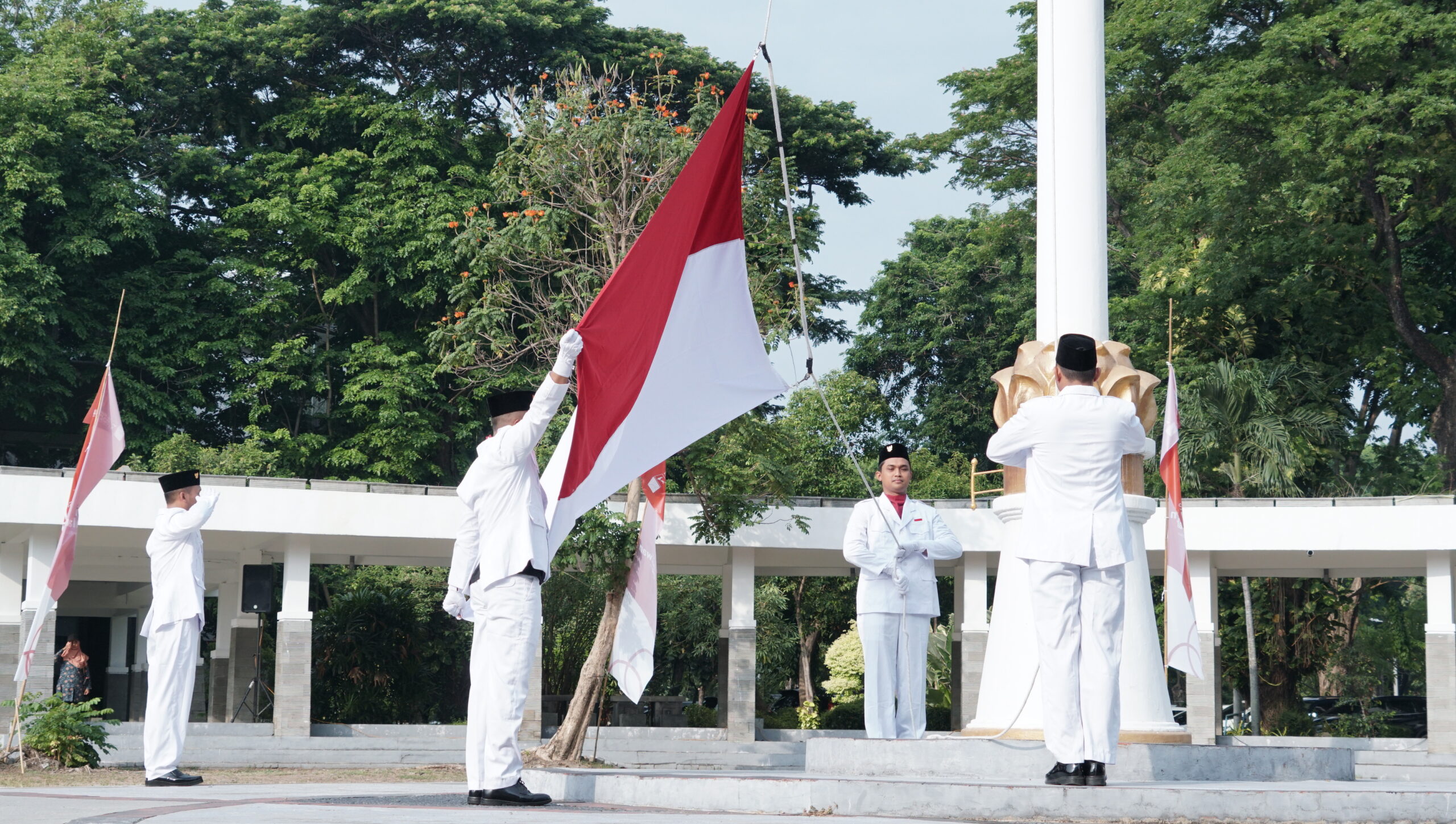 Petugas upacara Hari Pahlawan mengibarkan Bendera Pusaka Sang Saka Merah Putih di Lingkar Perpustakaan Pusat ITS