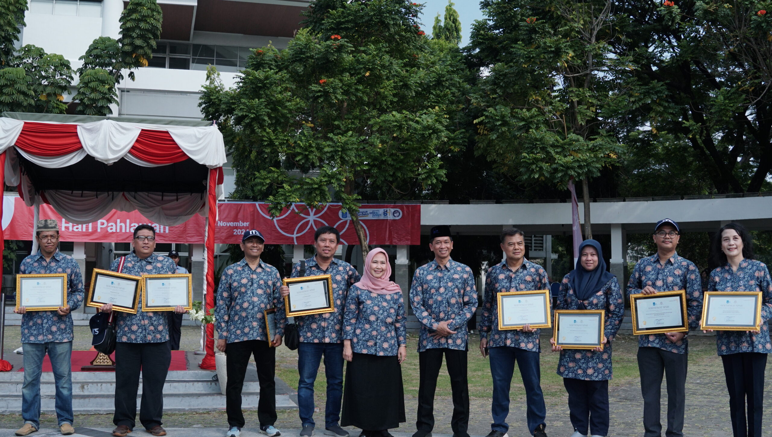 Kampus ITS, ITS News – Dalam rangka menghormati dan mengenang jasa para pahlawan bangsa, Institut Teknologi Sepuluh Nopember (ITS) menggelar upacara Hari Pahlawan di Lingkar Perpustakaan Pusat ITS, Minggu (10/11). Upacara yang bertepatan dengan Dies Natalis ITS ke-64 ini juga menjadi momen untuk mengapresiasi seluruh sivitas akademika ITS atas kontribusinya membangun bangsa.