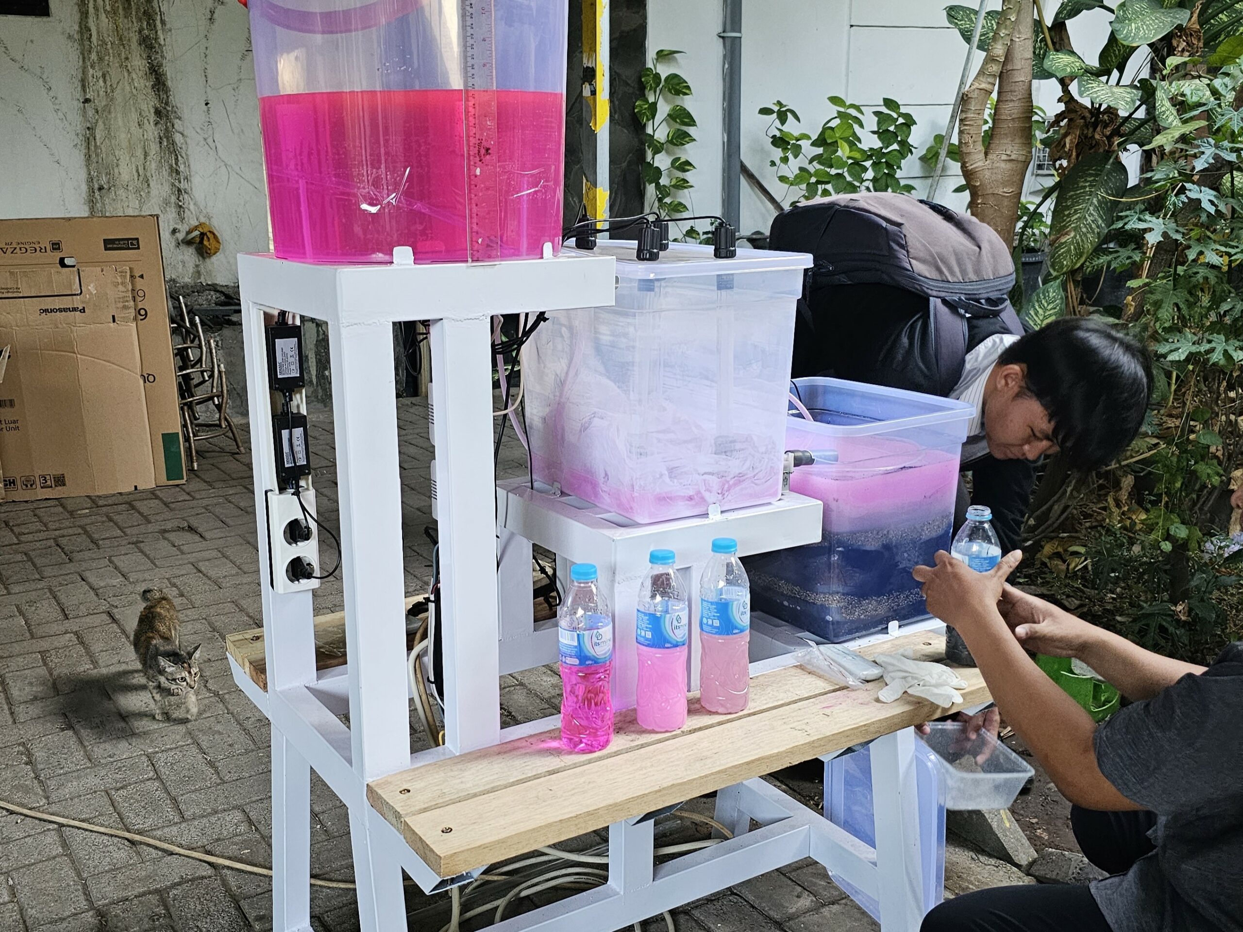 Selanjutnya, air limbah yang mulai memudar warna merah mudanya akan diproses melalui tabung filtrasi berisi material penjernih air. Tabung tersebut berisi pasir silika, karbon aktif, pelepah kelapa, zeolit, dan batu kerikil. Sigit membagikan, melalui hasil uji laboratorium didapatkan bahwa nilai absorbansi air limbah menurun signifikan dari yang awalnya 0,4 menjadi 0,08 satuan absorbansi.  “Setelah melalui dua tahap pengolahan dengan alat ini,” jelas mahasiswa asal Samarinda tersebut.