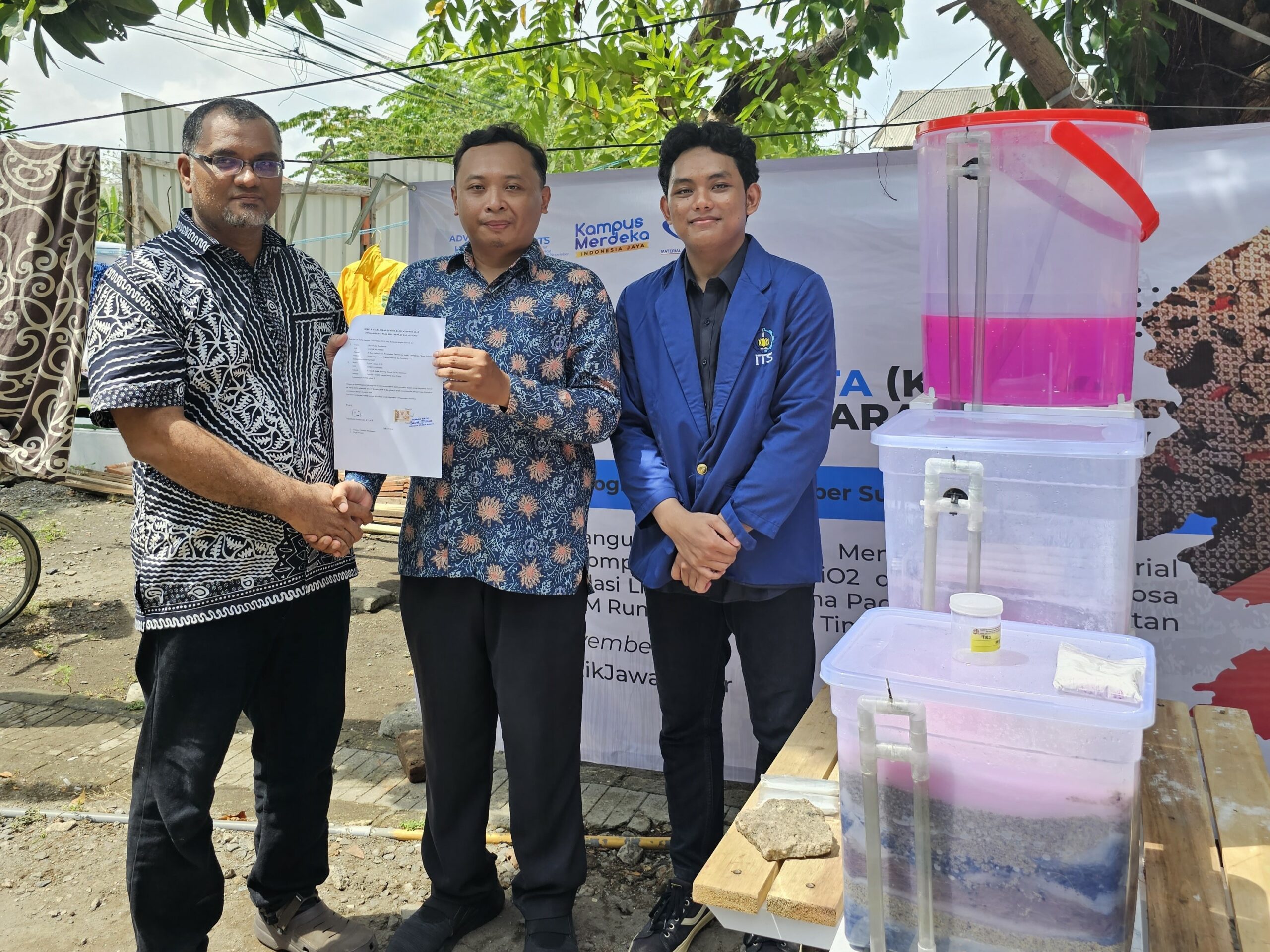 Dosen Pembimbing tim KKN Abmas DTMM ITS Haniffudin Nurdiansah ST MT (tengah) saat menyerahkan alat filtrasi air limbah batik kepada pengelola Rumah Batik Jawa Timur, Syarif Usman (kiri)