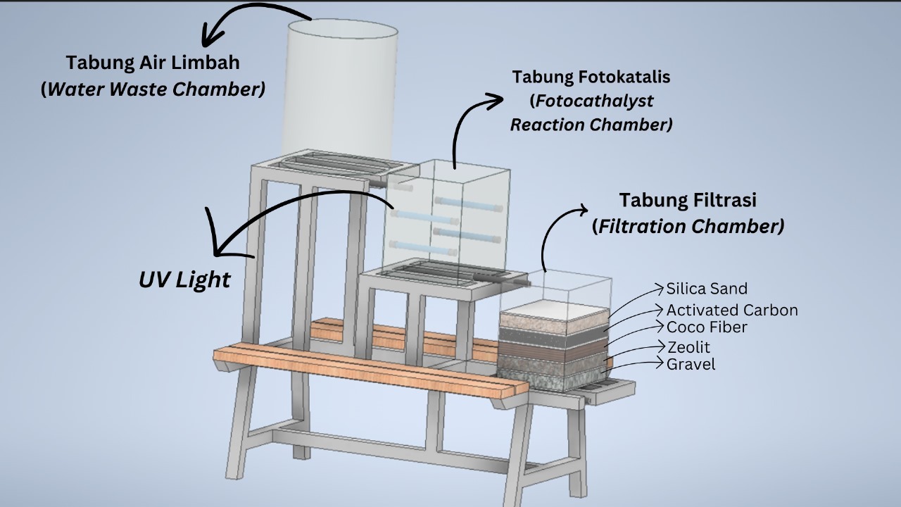 Mahasiswa angkatan 2022 tersebut mengungkapkan, dengan alat ini, air limbah akan melalui dua tahap pengolahan. Pada tahap pertama, air limbah akan diolah menggunakan tabung fotoreaktor. Dalam proses ini, air limbah ditambahkan dengan material komposit titanium dioksida (TiO2) dengan sedikit nanoselulosa untuk mendegradasi zat pewarna. Kemudian, proses degradasi akan dipercepat dengan bantuan sinar ultraviolet (UV) dalam tabung fotoreaktor.