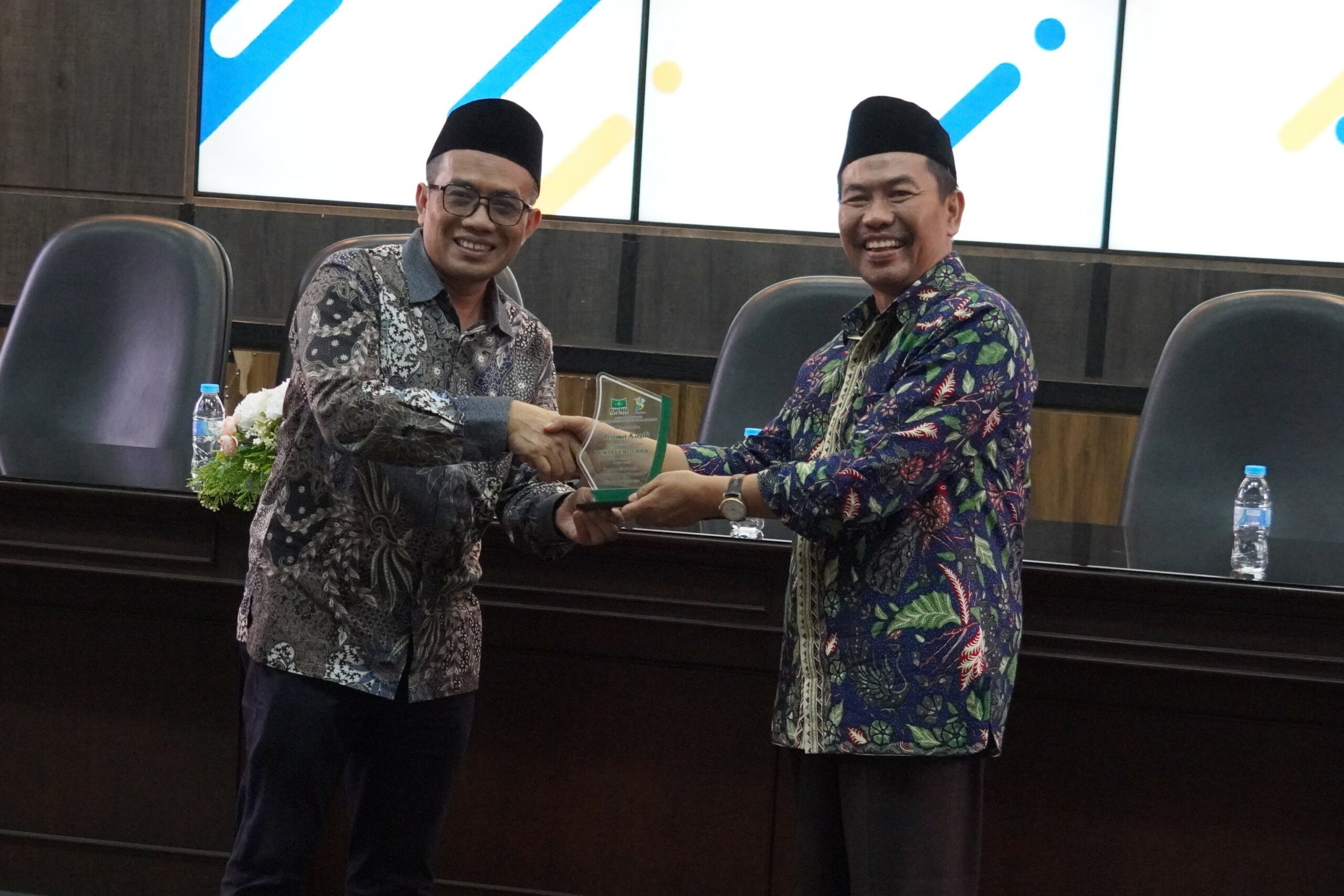Penyerahan cinderamata dari PWNU Jatim oleh Prof Drs Kacung Marijan MA PhD (kanan) kepada Wakil Rektor II ITS Dr Ir Machsus ST MT (kiri)