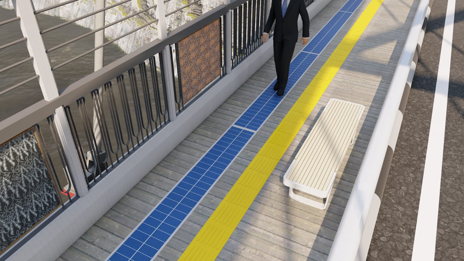 Desain trotoar pada Jembatan Arunika yang mengusung konsep pedestrian friendly untuk kenyamanan pengguna dengan memanfaatkan piezoelectric (warna biru) guna menghasilkan energi listrik