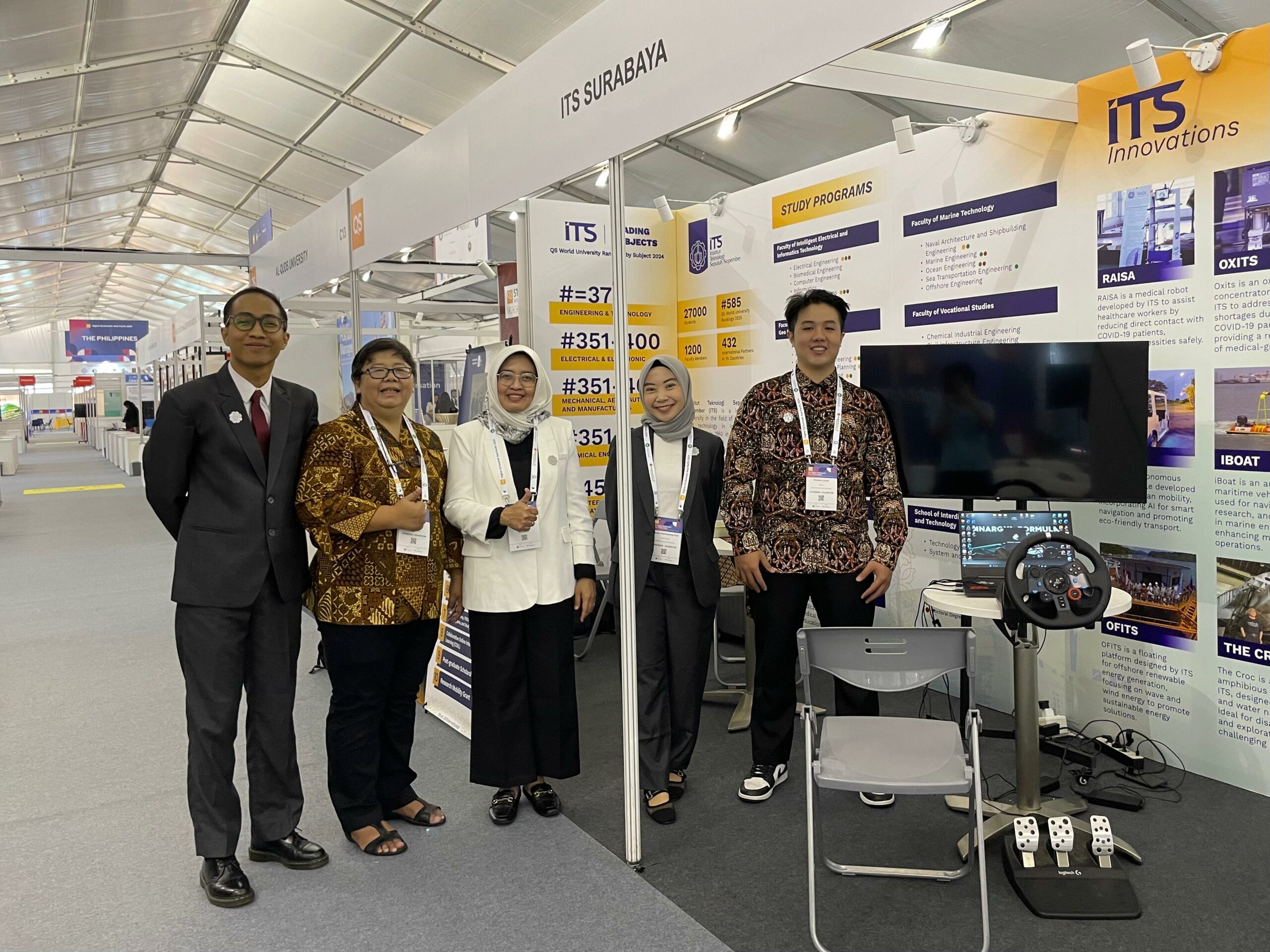 Delegasi ITS saat menjelaskan mengenai karya inovasi dari ITS yang dipamerkan pada exbibition di QS Higher Ed Summit Asia Pacific 2024