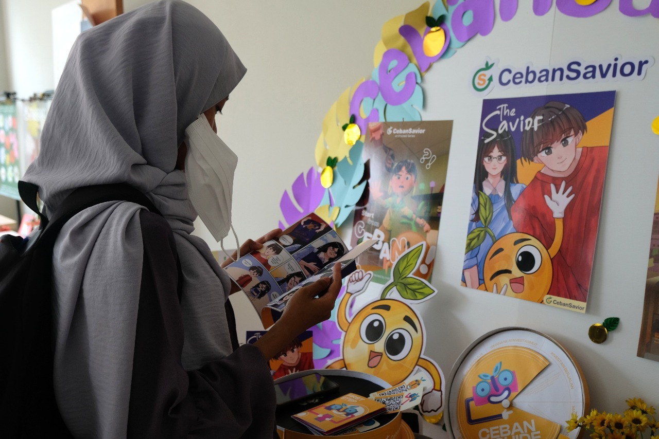 Salah satu warga pengunjung pameran saat membaca komik edukasi perencanaan keuangan karya mahasiswa Departemen DKV ITS