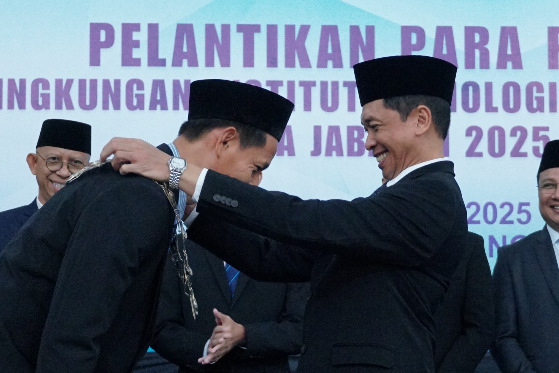 Rektor ITS Prof Ir Bambang Pramujati ST MScEng PhD (kanan) saat memasangkan kalung jabatan dekan kepada Juwari ST MEng selaku Dekan Fakultas Teknologi Industri dan Rekayasa Sistem (FTIRS) ITS