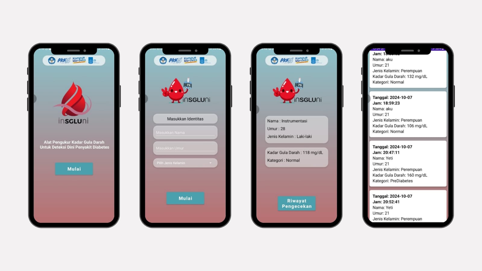 Tidak hanya itu, Insgluni juga dibekali dengan aplikasi berbasis android yang dapat dihubungkan dengan jaringan wi-fi. Aplikasi ini akan menerima dan menampung rekaman data pengujian kadar gula darah serta memberikan informasi kesehatan pengguna. Dengan demikian, pengguna dapat memantau dan mengontrol kadar gula darah secara teratur dan rutin.
