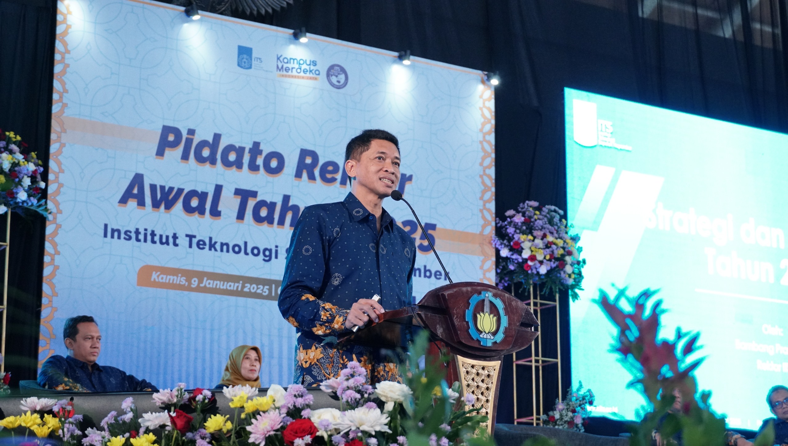Rektor ITS Prof Ir Bambang Pramujati ST MSc Eng PhD saat menyampaikan materinya dalam Pidato Rektor Awal Tahun 2025 di Graha Sepuluh Nopember ITS
