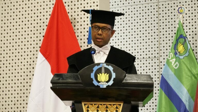 Dekan Fakultas Vokasi (FV) ITS periode 2024-2029 Prof Dr Wahyu Wibowo SSi MSi ketika menyampaikan orasi ilmiahnya sebagai guru besar ke-163 ITS