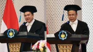 (dari kiri) Prof Agus Muhamad Hatta ST MSi PhD dan Prof Dr Ir Agus Sigit Pramono DEA yang dikukuhkan menjadi profesor ke-207 dan 208 ITS