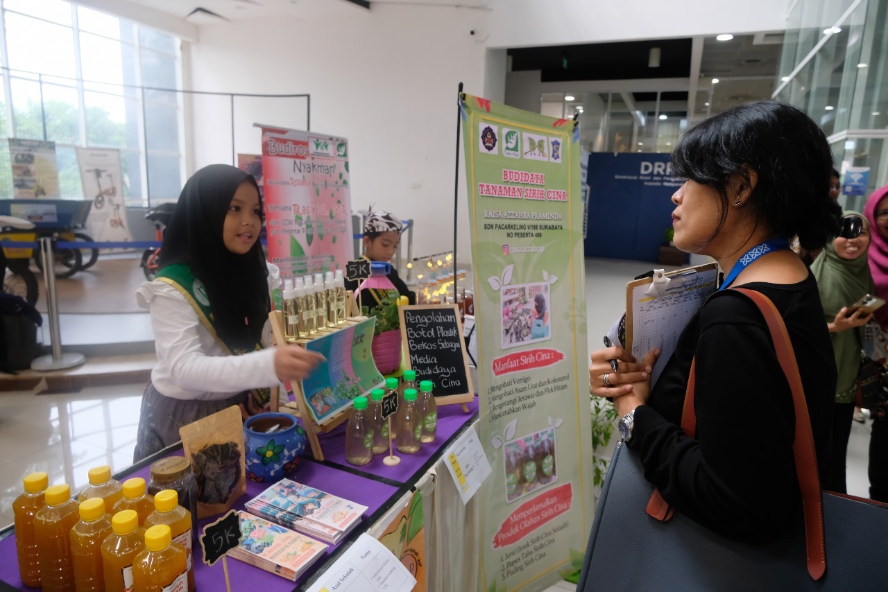 Puteri Lingkungan Hidup dari SDN Pacarkeling V Surabaya (kiri) saat menjelaskan produk inovasi ramah lingkungan kepada tim juri