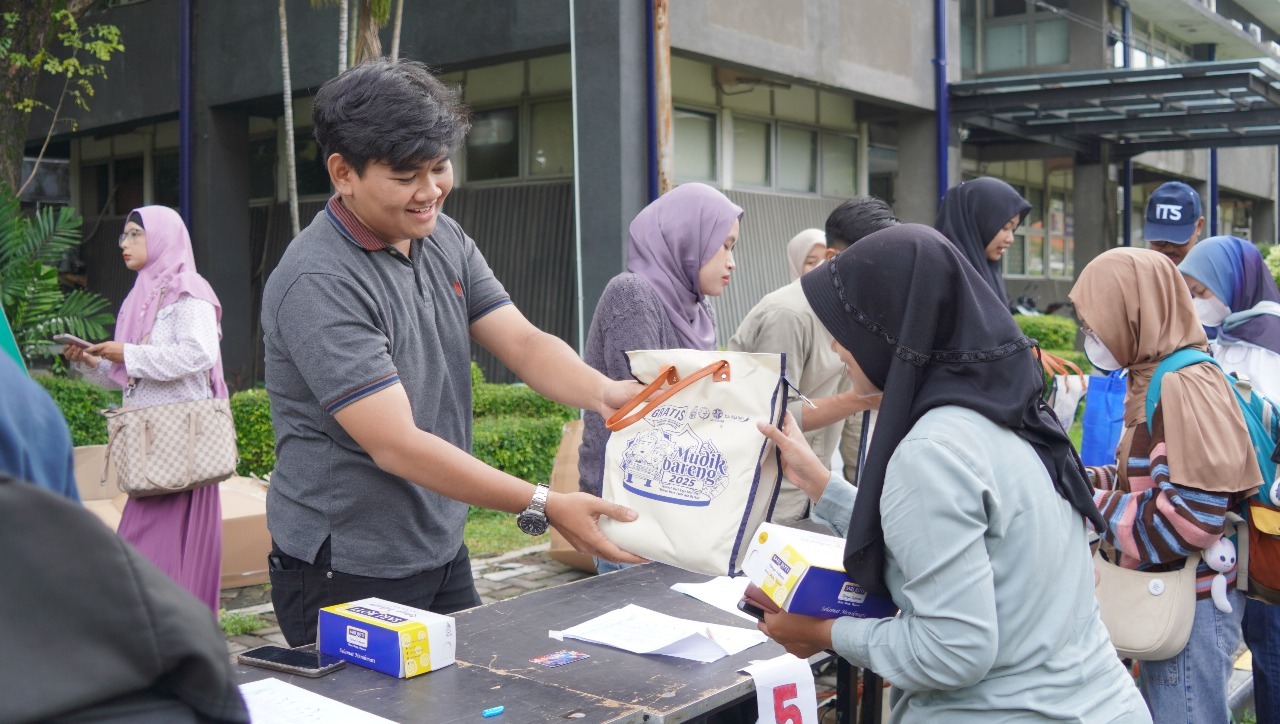 Panitia Mudik Bersama ITS 2025 membagikan goodie bag kepada peserta Mudik Bersama ITS 2025