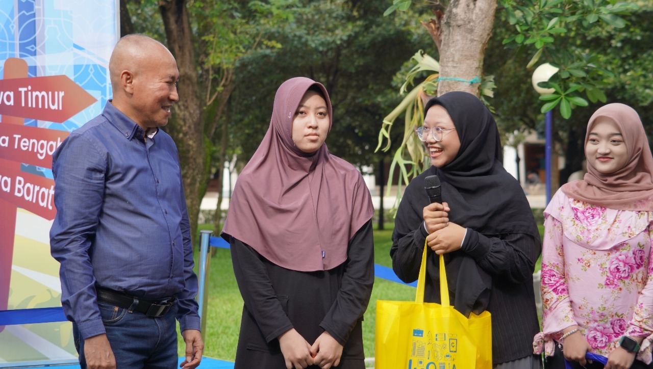 Salah satu peserta mudik (memegang mic) saat menyampaikan kesannya dapat mengikuti mudik bersama kepada Ketua Ikoma ITS Dr Ir Wahid Wahyudi MT (kemeja biru)